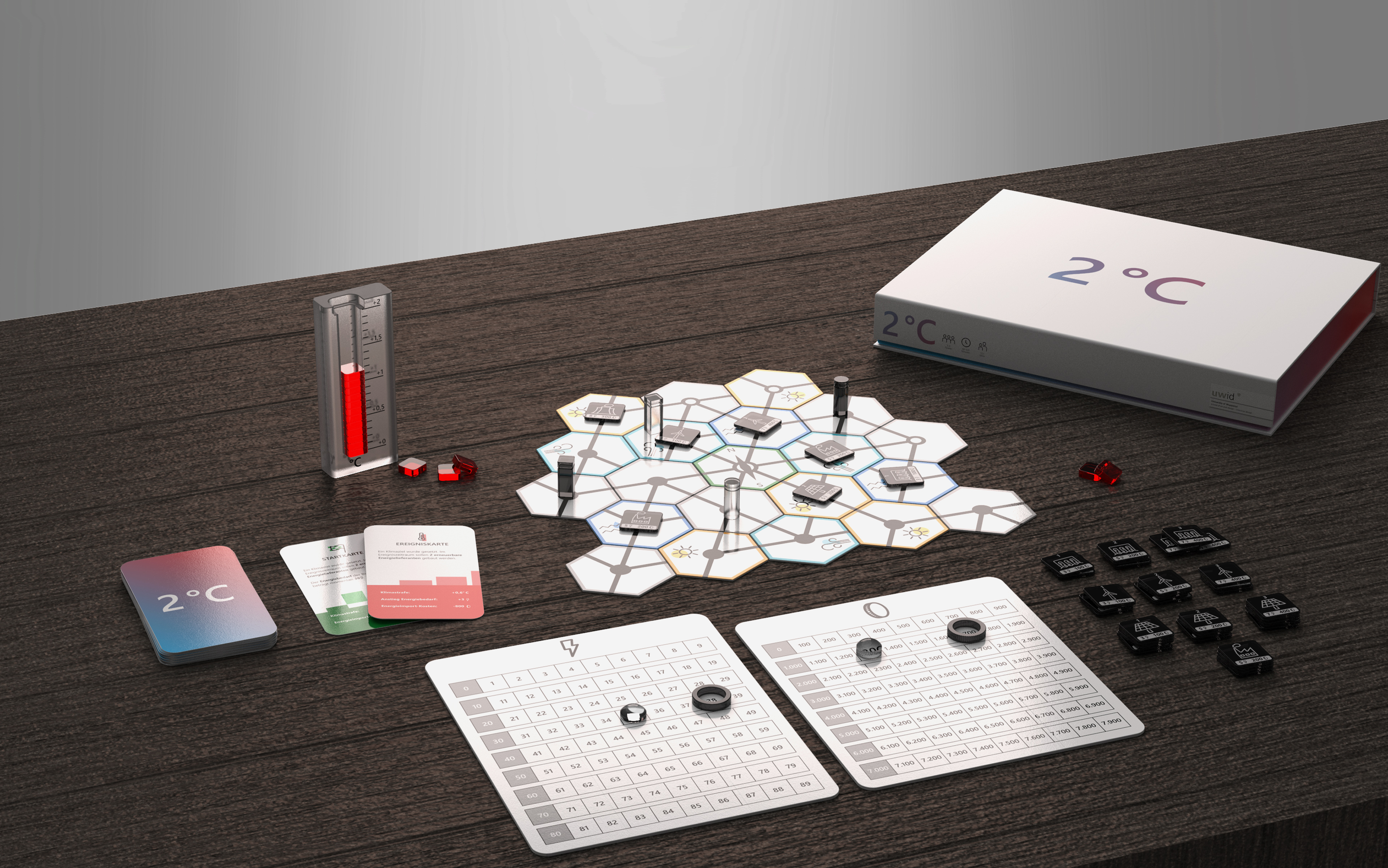 2 °C ist ein kooperatives Spiel, in dem ihr das gemeinsame Ziel verfolgt, alle Kohlekraftwerke und das Atomkraftwerk durch erneuerbare Energielieferanten zu ersetzen. Eure Aufgabe ist es, die Energiewende umzusetzen und gleichzeitig den Strombedarf zu decken — kein einfacher Balanceakt. Die Zeit läuft euch davon, denn der Betrieb der Kohlekraftwerke sowie die Nichteinhaltung der Klimaziele beschleunigen den Klimawandel: die globale Temperatur steigt an. Verhindert zusammen, dass die 2-Grad-Grenze erreicht wird!